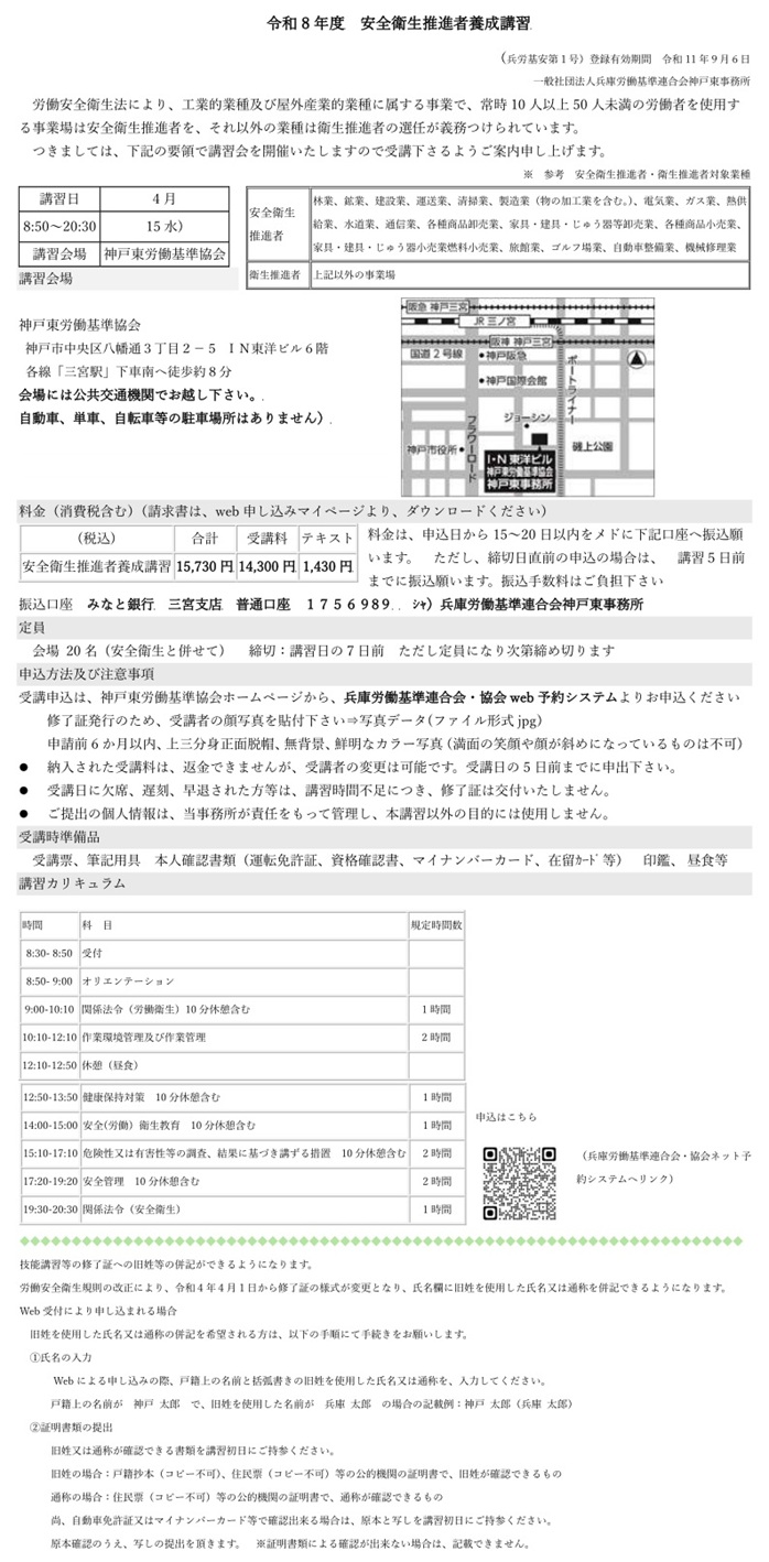 令和8年度 第1回4月15日(水) 8:50~20:30 講習会場 神戸東労働基準協会